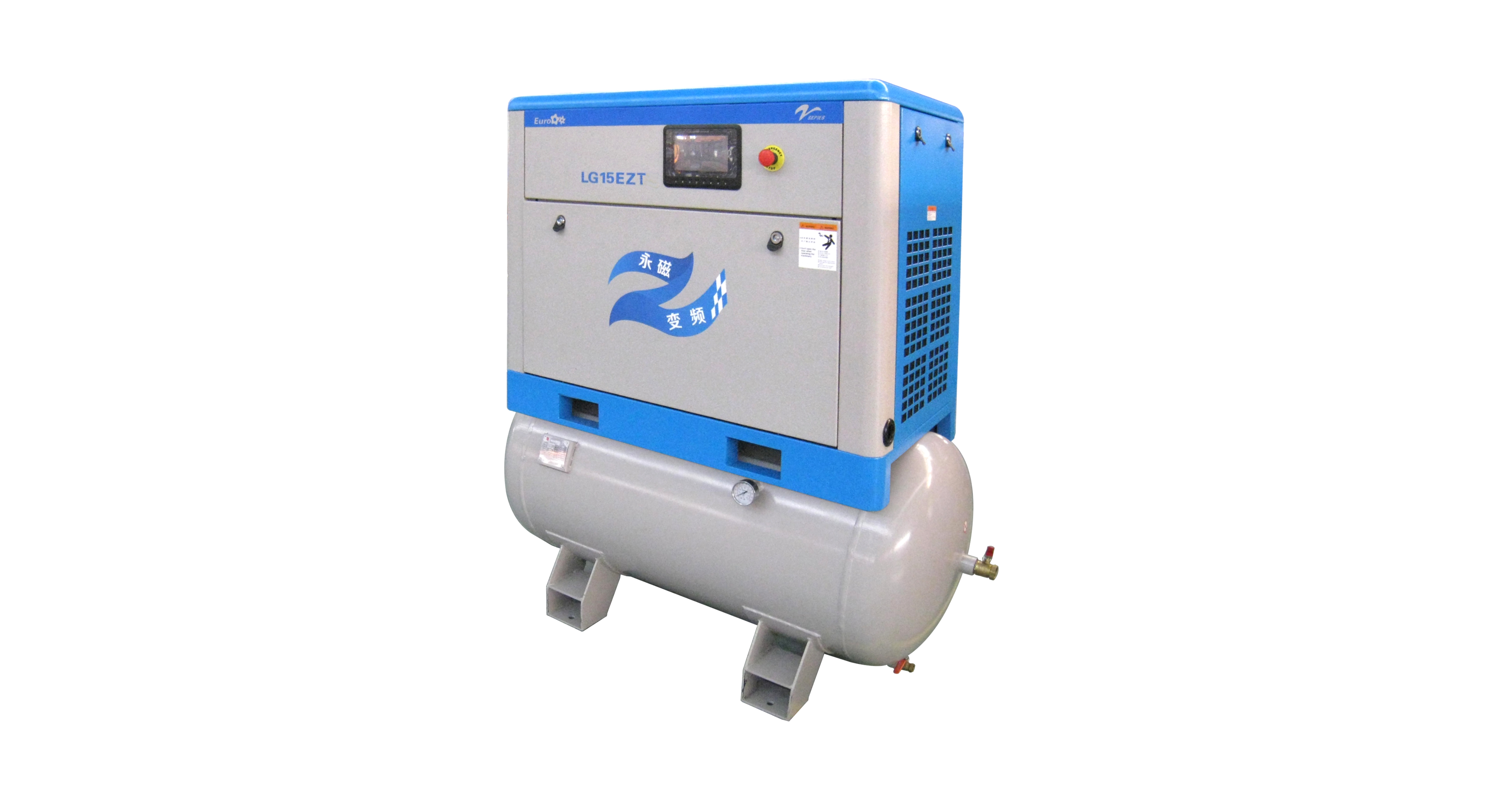 泰山系列:永磁,变频, 风冷, 卧式直联一体机 / 功率:11kW/15kW / 风量:1.0m3/min/1.5m3/min / 压力:1.6 MPa / 自带冷干机, 过滤器, 气罐, 专为T型激光切割机设计